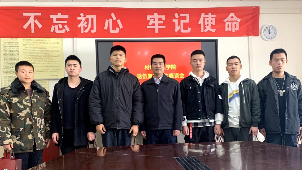 党委副书记(主持工作)喻强、学院征兵工作负责辅导员王亚男出席,2020年退伍复学学生代表17材料科学与工程(单)周柏江,18材料科学与工程(视光材料与应用)(1)李治、刘毅凡,18复合材料与工程(2)谭海波,20材料科学与工程刘昌灵、张侃参加本次会议。