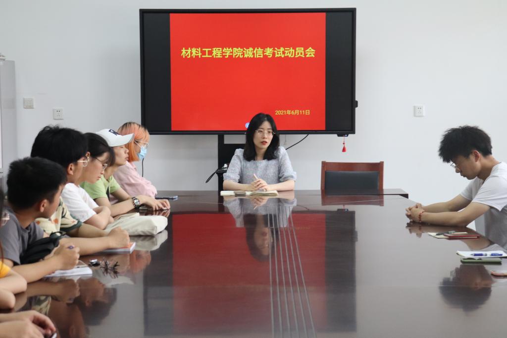 于6月11日中午在工科楼会议室召开诚信考试动员会,会议由辅导员王亚男主持,各班班长、学习委员、学生代表参加。