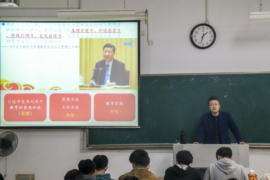 桂始馨老师从习近平总书记的讲话出发,结合当今社会现状,进行了一系列有关教育主题和理论的生动分析。他认为,“始终坚持社会主义办学方向,坚持走中国特色社会主义教育发展道路,彰显中国特色社会主义道路自信”是习近平总书记关于教育的重要论述中的核心要点,全校师生应该以此为奋斗方向,结合时代主题做好本职工作,为第二个百年奋斗目标增添力量。同学们认真听讲,认真记录,现场学术氛围十分浓烈。