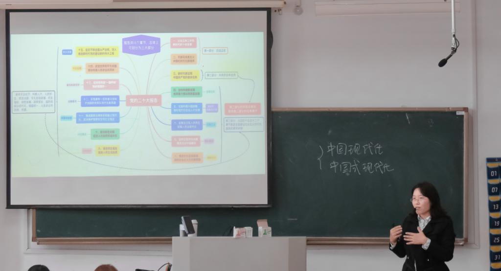 在讲座中,邱勤老师积极提问,从各种角度帮助学生理解二十大精神,并讲述国家历史,激起同学学习热情。马克思主义中国化时代是讲座中出现的高频词汇,邱勤老师热情地告诉同学:马克思主义中国化时代的最新理论成果为习近平新时代中国特色社会主义思想。同时老师总结了“10个明确”“14个坚持”“13个方面的成就”的相互关系以及中国共产党的中心任务。在聆听讲座过程中,同学们面对老师提出的问题都进行了认真的思考并积极配合,同时也提出自己对二十大精神的看法理解和问题。同学们表示会在生活中、学习中积极贯彻党的二十大精神,做到知行合一,肩负光荣使命,勇担历史重任,以青春之热血、青春之干劲肩负起国家民族之希望。
