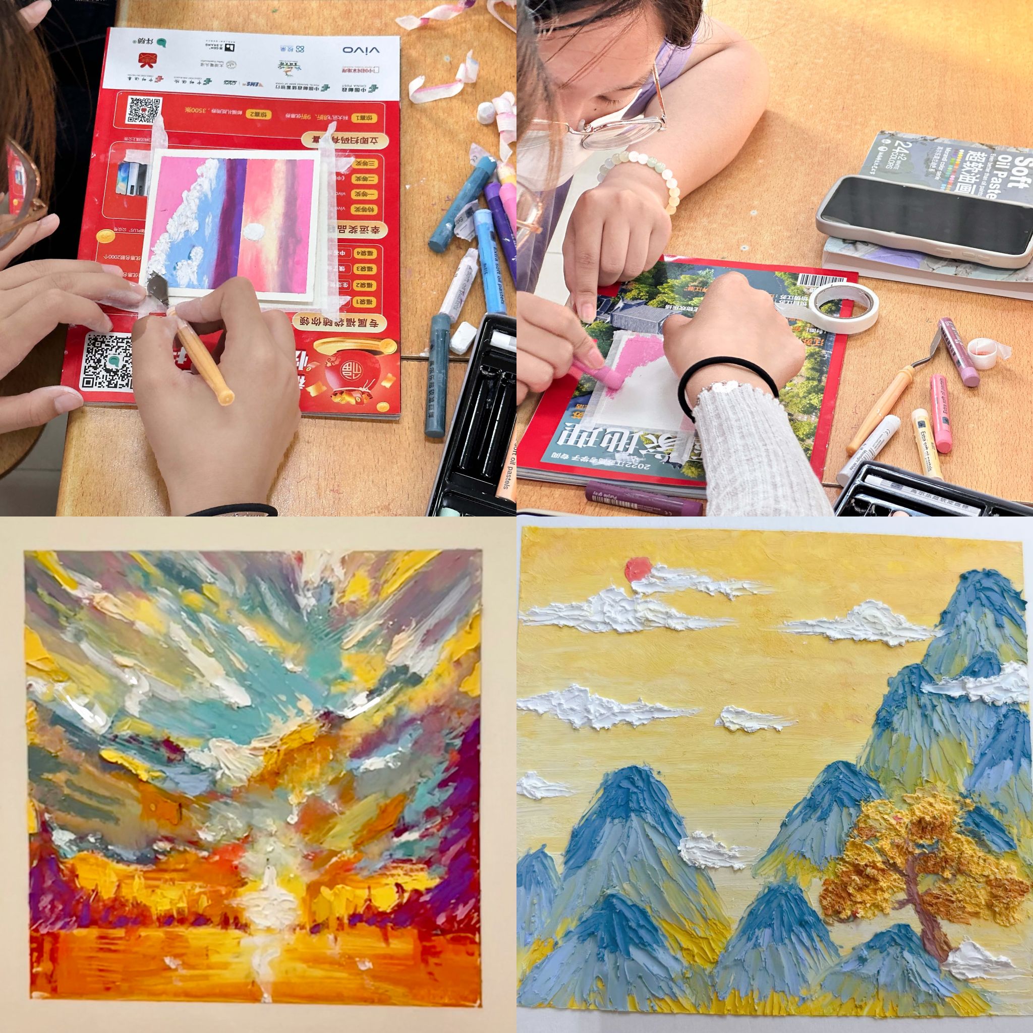 本次活动吸引了众多热爱绘画的同学参加,他们以不同的颜色、不同的视角用油画棒创作出了一个个精美绝伦的作品。有人画静谧的乡村,有人画绚烂的晚霞,有人画烟雨的江南……不同的景色但却同样的美丽。同学们在动手绘画的过程中,激发了兴趣,感受到了艺术的乐趣,更深刻地认识到了祖国大好河山的巍峨壮美。