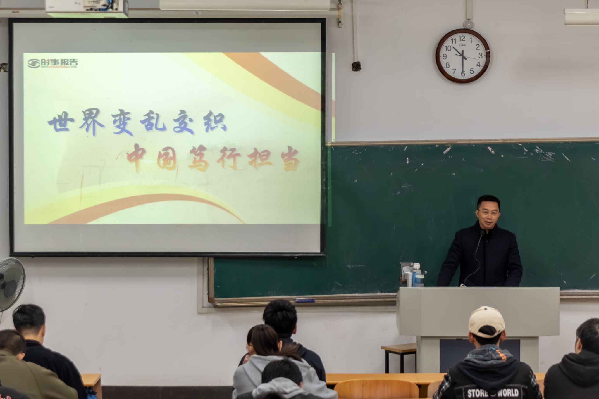 陈教授从世界变革动荡持续的演进、世界经济的变化、大国关系的调整、中国智慧彰显担当等方面展开讲解,通过列举乌克兰战争、欧美关系裂痕持续加深和中俄伙伴关系高水平发展等例子,阐释了世界动荡变化之下的挑战以及中国的担当。陈教授指出,目前国际社会面临多方面的挑战,世界范围内变革动荡在持续演进,发展是人类社会永恒的主题,合作是实现共赢的阶梯。在此背景下,大国关系也发生着深刻的调整,一些国家地区矛盾不断激化、国家关系裂痕持续加深,但中国始终致力维护大国关系,坚持不懈探索国家间正确的相处之道,为推进全球稳定和繁荣不断做出努力。希望同学们能正视国际形势,不忘初心,牢记使命,为祖国的强大奋力而行!