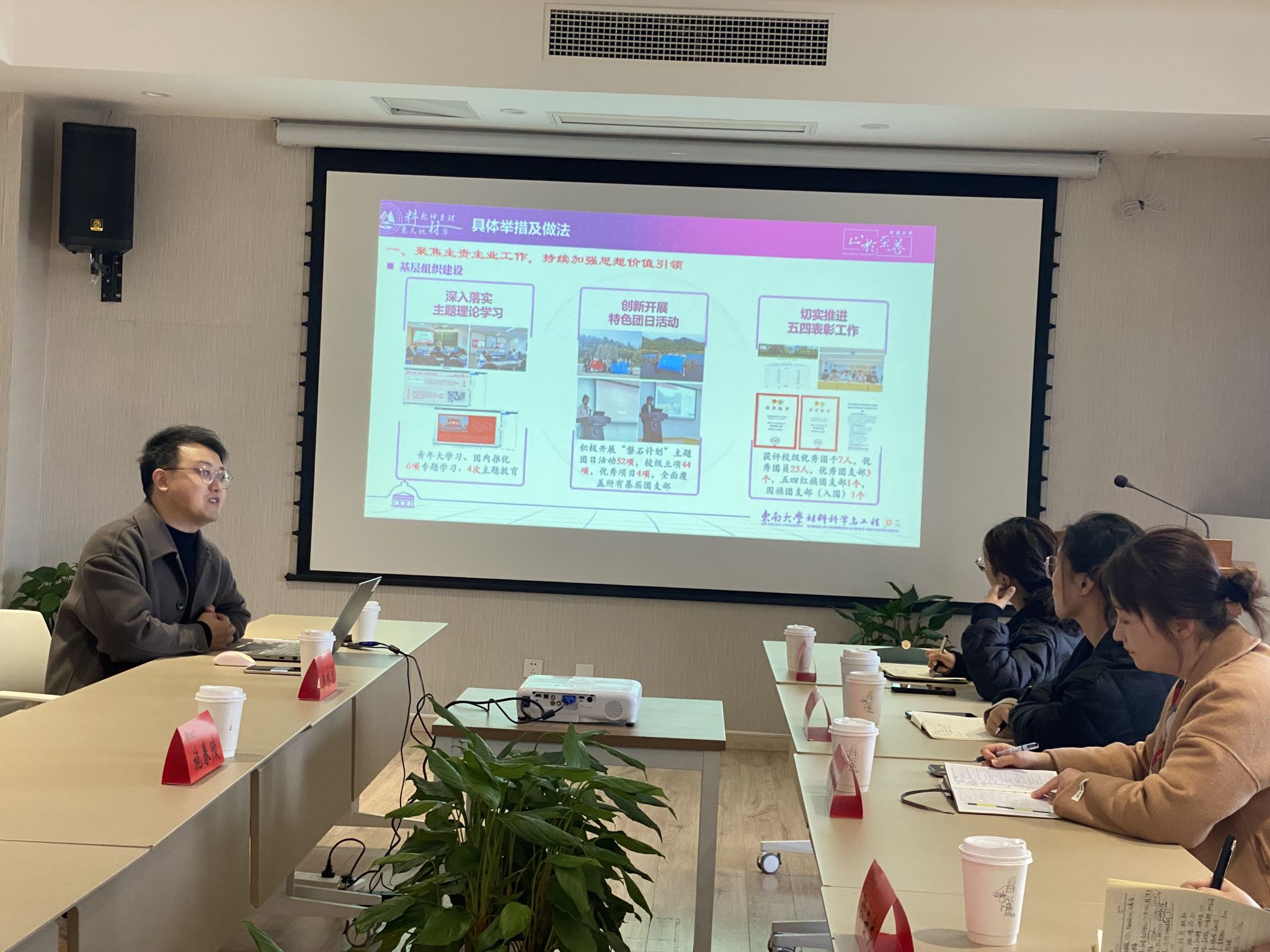 党委副书记韩铖、学工办主任许倩颖、团总支书记邵云龙及全体辅导员,赴东南大学材料科学与工程学院开展学生工作交流研讨。东南大学材料科学与工程学院党委副书记兼副院长施春陵、学办主任兼分团委书记韩林原、院兼职辅导员徐邦利和学办助管等出席交流会,会议由韩林原主持。
