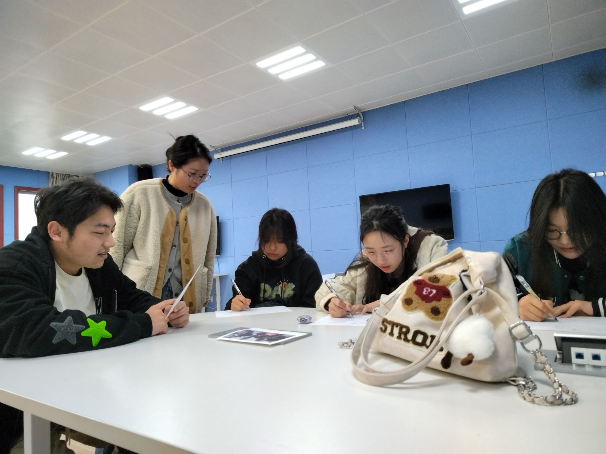 活动伊始,副书记韩铖热情且亲切地与同学们分享了人际交往的重要性,鼓励同学们在游戏中启发内心的思考,正确认识自己和他人。随后,团辅活动在王老师的带领下有序开展,包括“破冰之两假一真”“我说你画”“温暖的祝福”三个主题。在游戏中,同学们从生疏到熟悉,通过真诚的交流拉近了彼此的距离,锻炼了沟通与倾听的能力。最后,王老师让同学们围成一个圈,在纸上写下想对他(她)说的话,并分享自己的感受。心理团辅活动在欢快温馨的氛围下,渐渐接近尾声,同学们纷纷表示活动非常有趣,期待下一次的团辅活动。
