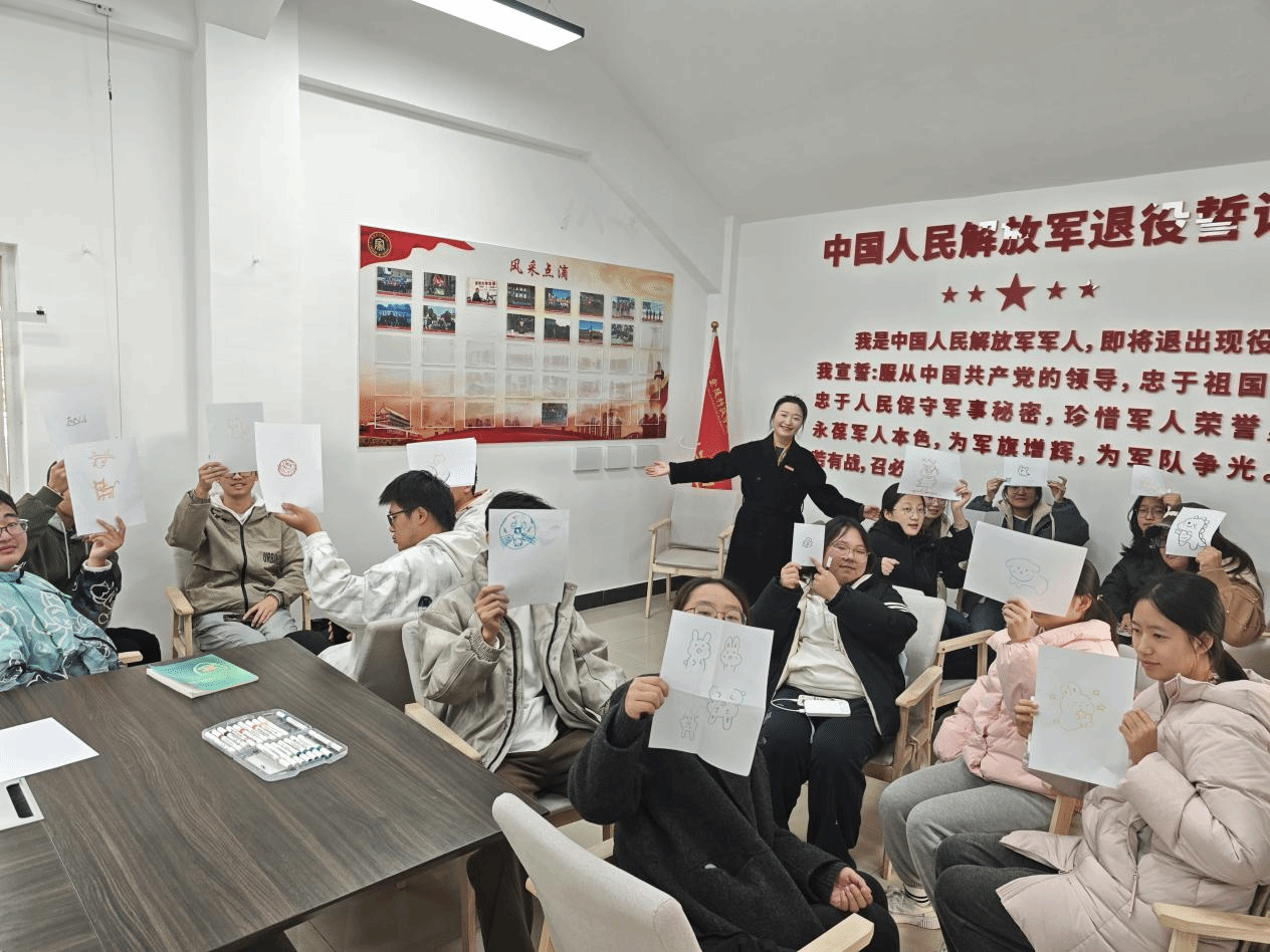 活动伊始,“滚雪球”自我介绍环节迅速拉近了彼此的心理距离,原本陌生的面孔逐渐变得熟悉,现场互动的热情也不断升温。“心随‘萌’动——画出我的动物画像”环节则让新生们开启了自我探索的旅程,有的同学画了慵懒的小猫,认为自己随性淡然;有的同学画了灵动的小兔子,希望像小兔一样保持敏锐的感知力……一幅幅充满创意的画作,成为了新生们表达自我的独特载体。