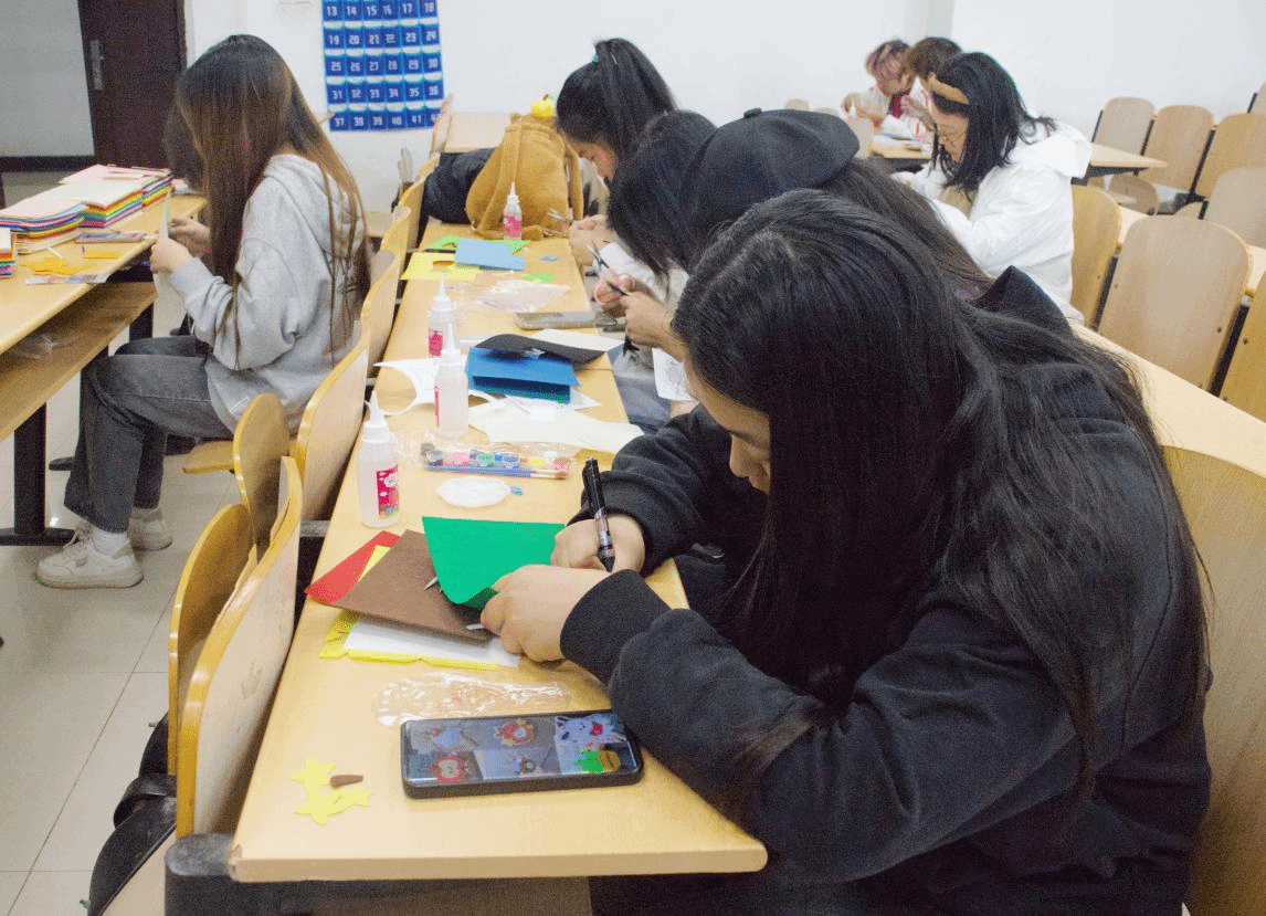 活动伊始,主持人首先进行了简单的制作教学,为同学们提供了基本的技术指导。随后,同学们充分发挥自己的想象力与创造力,自主挑选材料,通过剪裁、拼贴色彩丰富的不织布,辅以颜料描绘等步骤,制成各种美观而富有创意的挂件等饰品。同学们或独立创作,或组成双人小组,互相帮助,共同探讨,勇于展示自己的独特想法和创意作品。活动现场气氛热烈,整个制作过程中,大家沉浸在手工艺术的魅力中,将平凡的不织布转化为充满创意与温度的作品,不仅收获了成就感,也感受到了校园生活的乐趣与幸福感。
