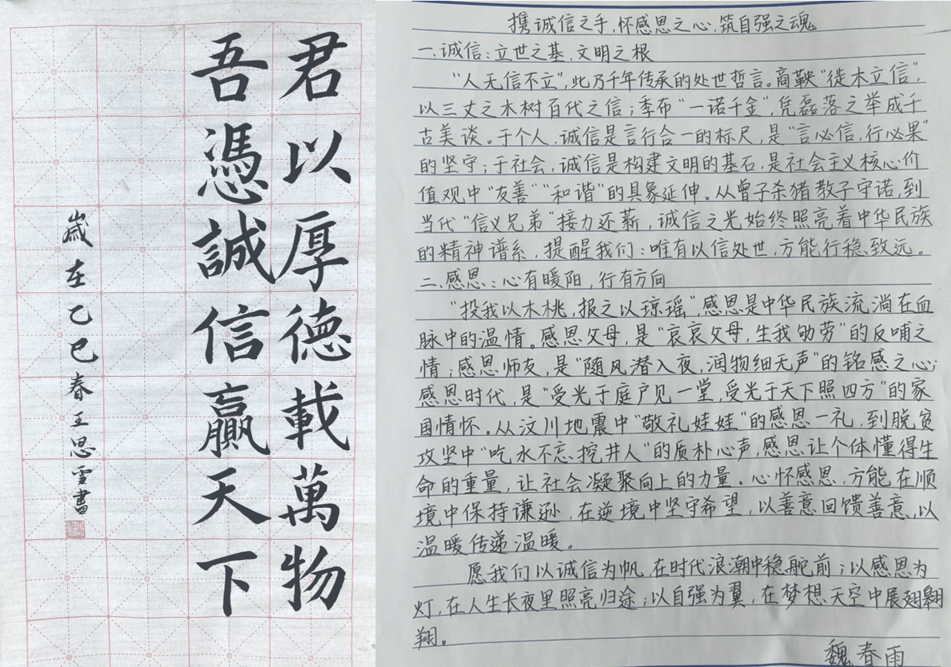 学院以“诚信立身,感恩前行”为主题,面向全体学生征集诚信、感恩主题书法作品。活动开展以来,同学们积极参加,硬笔、软笔书法各具特色,一幅幅作品诠释了诚信的内涵。此次活动不仅弘扬了中华优秀传统文化,更让诚信、感恩观念在笔墨丹青间深入人心。