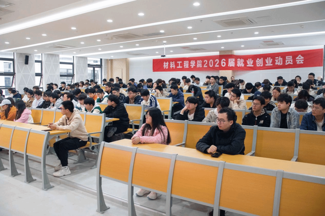 在崇文楼110教室召开2026届毕业生就业创业动员会。学院党委书记陈健、副书记韩铖,各系负责人李新华、林青、庞娟、周历,毕业班班主任、辅导员及2026届全体毕业生参会,特邀优秀校友李宗堂(2024届材料科学与工程专业毕业生,现任江苏博思通新材料有限公司初级工程师、总经理办公室市场专员)及26届已就业学生代表做经验分享。