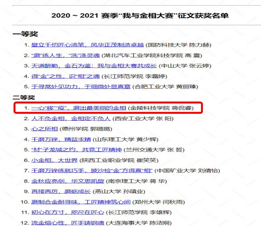 林青、王威、唐正霞、赵毅杰等老师指导,19材料科学与工程班李旭同学荣获全国二等奖,19材料科学与工程班刘苗苗同学荣获全国三等奖,20材料科学与工程班刘昌灵同学荣获全国三等奖,18材料科学与工程班蒋侃睿以第6名成绩荣获最佳征文二等奖,赵毅杰老师荣获优秀指导教师荣誉称号。此外,李旭、刘昌灵和刘苗苗三位同学均报名且取得了机械行业职业能力证书。