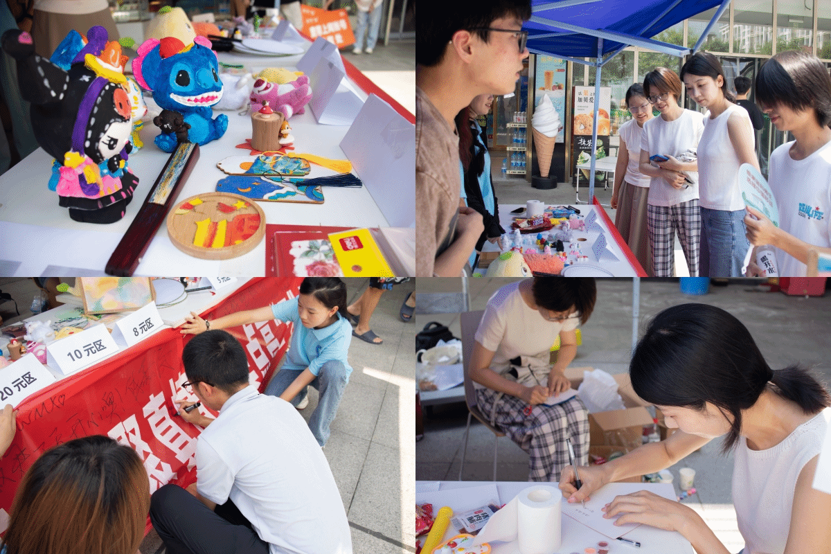 活动前期,我院“方舟”心理社成员、暑期实践“星光护航”志愿队成员进行了手工制作,包括掐丝珐琅杯垫与书签、石膏娃娃、漆扇等。“同学你好,义卖了解一下”“小小义卖,大大爱心”“走过路过,不要错过”……义卖现场的吆喝声此起彼伏,志愿者们都化身“摊主”,向来往“顾客”介绍商品,大家纷纷驻足选购,并在横幅上签名留念,或在贺卡上写下祝福送到小朋友们手中。9月2日,我院师生带着精心挑选的文具奔赴秦淮特殊教育学校参加开学典礼,向孩子们表达了亲切的关怀和新学期真挚的祝福。