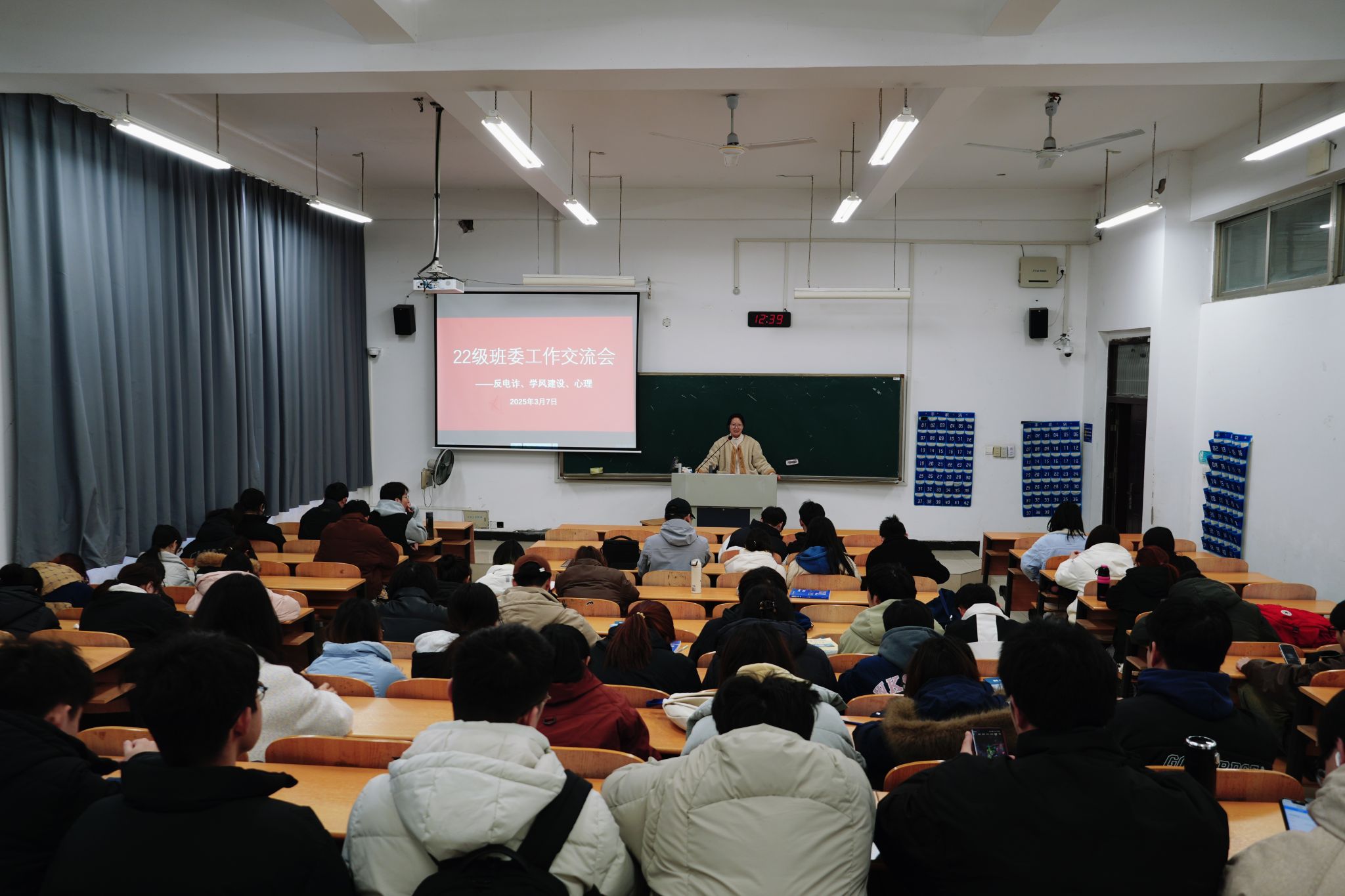于3月7日中午在QY1104教室召开了学生骨干培训会。本次班会由辅导员王敏主讲,围绕防范电信诈骗、加强学风建设和关注心理健康三个方面展开,22级全体班委参加。