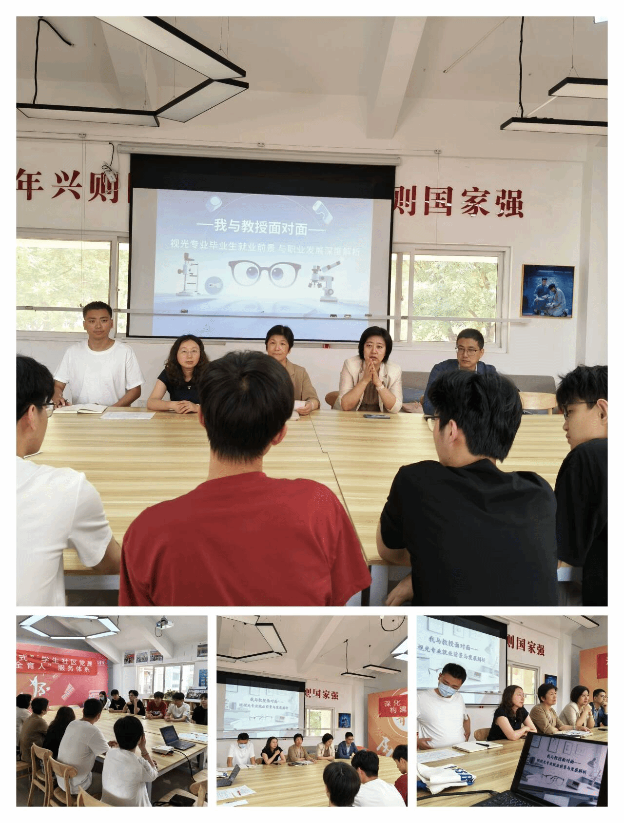在南区08栋一站式学生社区开展“视光与眼视光专业就业前景与职业发展双解析”师生面对面活动。活动围绕“精准服务毕业生”,开设“视光材料专业就业前景解析”“眼视光专业职业发展研讨” 两场主题座谈。学院党委书记陈健、视光系李新华、贾志超、王玲、亓昊慧、季雷、陈祥等多位教师代表,与21级视光材料与应用、眼视光学专业毕业生深入交流,共同探讨职业发展路径。