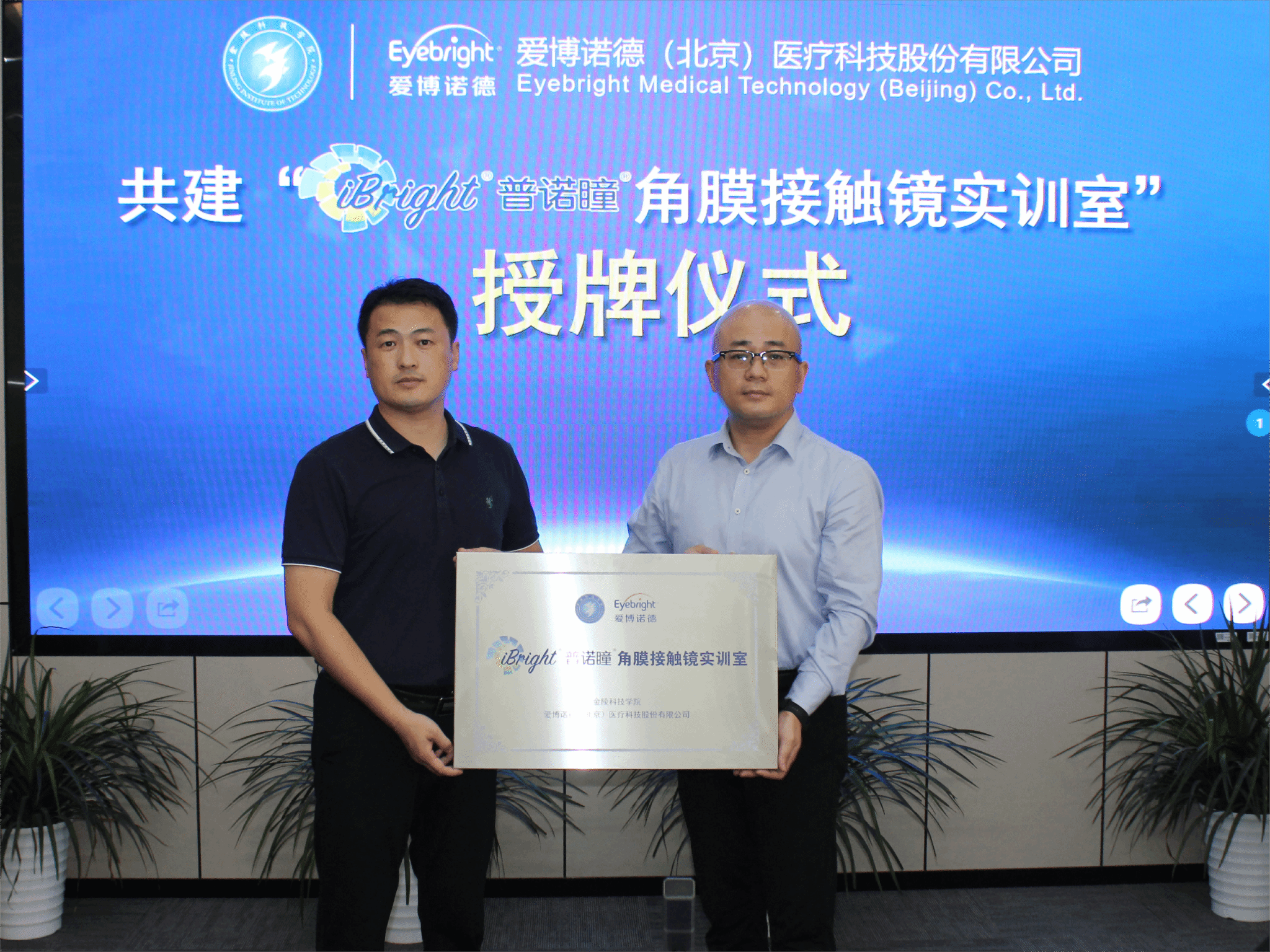 领导发言并顺利进行校企合作签约仪式。仪式结束后,爱博医疗企业代表为老师和同学们详细地介绍了企业基本情况、业务发展、技术平台及“星火计划”的发展规划。随后隆重举行了“普诺瞳角膜塑形镜硬镜&护理产品”捐赠仪式和共建“普诺瞳角膜接触镜实训室”授牌仪式,领导为参与普诺瞳“星火计划”专题培训且成绩优秀的学子代表颁发荣誉证书以表鼓励与表扬。老师指出,企业的慷慨捐赠不仅体现了企业的社会责任感,更体现了对教育事业的大力支持。在场同学对企业的善举表示了深深的感谢。